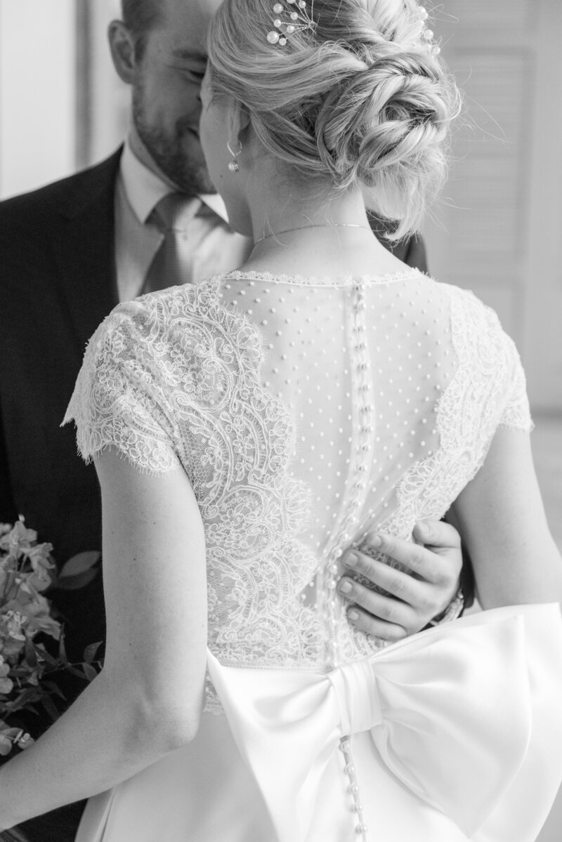 12:30pm Bride gets into her gown; second shooter photographs groom getting ready